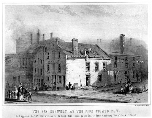 All accounts of the pre-Civil War New York neighborhood dubbed the Five Points include a description of the horrific living conditions of its largest structure, the Old Brewery. In the 1830s, the building had been converted to habitation, and quickly earned a reputation as the city’s worst tenement rookery, a place where even authorities feared to enter, sheltering hundreds of destitute residents, most of whom were recent immigrants.
