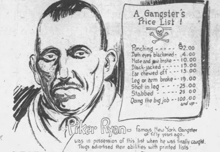 Despite Asbury’s inconsistent framing of Piker Ryan’s list, it turns out he did have a source: an October 23, 1909 article in the New York Evening Post entitled “Under Tammany,” written without a byline. The article profiled the unchecked gang activity that took place in New York under the watch of Tammany politician Big Tim Sullivan. Down in the article, the author writes: “They have their prices for any job politicians or other persons may call upon them to perform. ‘Piker’ Ryan’s price list has become a classic, ranging from $5 for ‘chawing off an ear’ to $200 for the ‘big job.'” [Note the price differences from Asbury’s list].