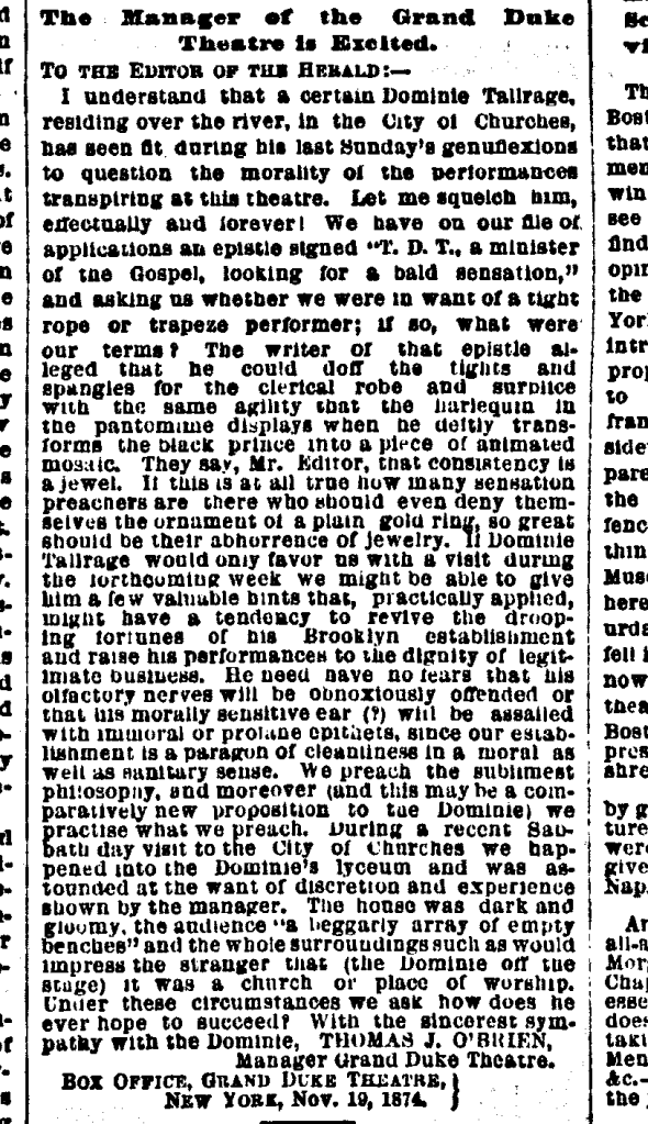 The fare they offered consisted mainly of comedic sketches, with a heavy emphasis on blackface minstrels, along with German, Jewish, and Irish caricatures. The same type of acts were found in the most popular Bowery theaters of the time–there was no meanness or violence to speak of. However, that did not stop moralists like Dr. Thomas DeWitt Talmadge, the leading religious orator of Brooklyn and New York in the 1870s, from decrying the wickedness of the theater’s offerings. In response, the Duke’s Thomas J. O’Brien published a masterful mocking letter to the editor of The New York Herald, poking fun at “Tallrage”: