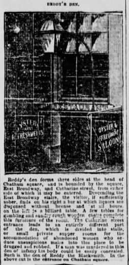 As New York City nightlife moved from lower Manhattan further north to the Tenderloin in the last decades of the 1800s, the Bowery area lost its dance halls and the “slummers” who came to spend their money. In Chapter XIV, Section 4 of The Gangs of New York, Herbert Asbury provides a roster of the low dives that replaced them, that came to typify the changes to the neighborhood: