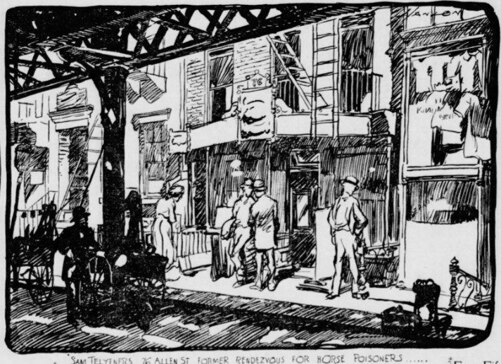 In Section 3 of Chapter XVI of The Gangs of New York, Herbert Asbury mentioned three East Side gang leaders who carved out a specialty in the field of extortion: poisoning the work horses used by delivery companies and street vendors, as well as the stables that housed the animals. At times these gangs worked on their own behalf, demanding payoffs from the businesses they threatened. However, at other times they were commissioned to sabotage a business under a contract with that business’s competitor. Indeed, it appears that this racket emerged on the Lower East Side and across the river in Brooklyn from this motive, and flourished in the cutthroat capitalism economic atmosphere of the predominantly Jewish immigrant communities. Small businesses were territorial, and any intrusions into a business’s market service area was seen as a personal threat to one’s livelihood.